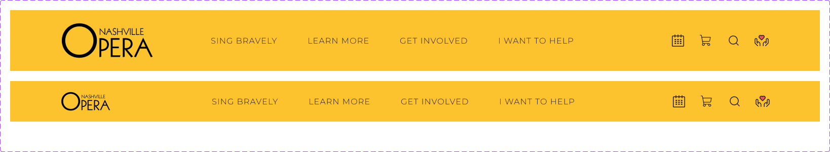 The menu is available in two variations. First, in an expanded format with larger logo. This version is visible when users first open a page on the website. Second, a narrower version with smaller logo. This version is visible as users scroll down the page. This "sticky" menu bar will always be visible at the top of the page as users scroll down.